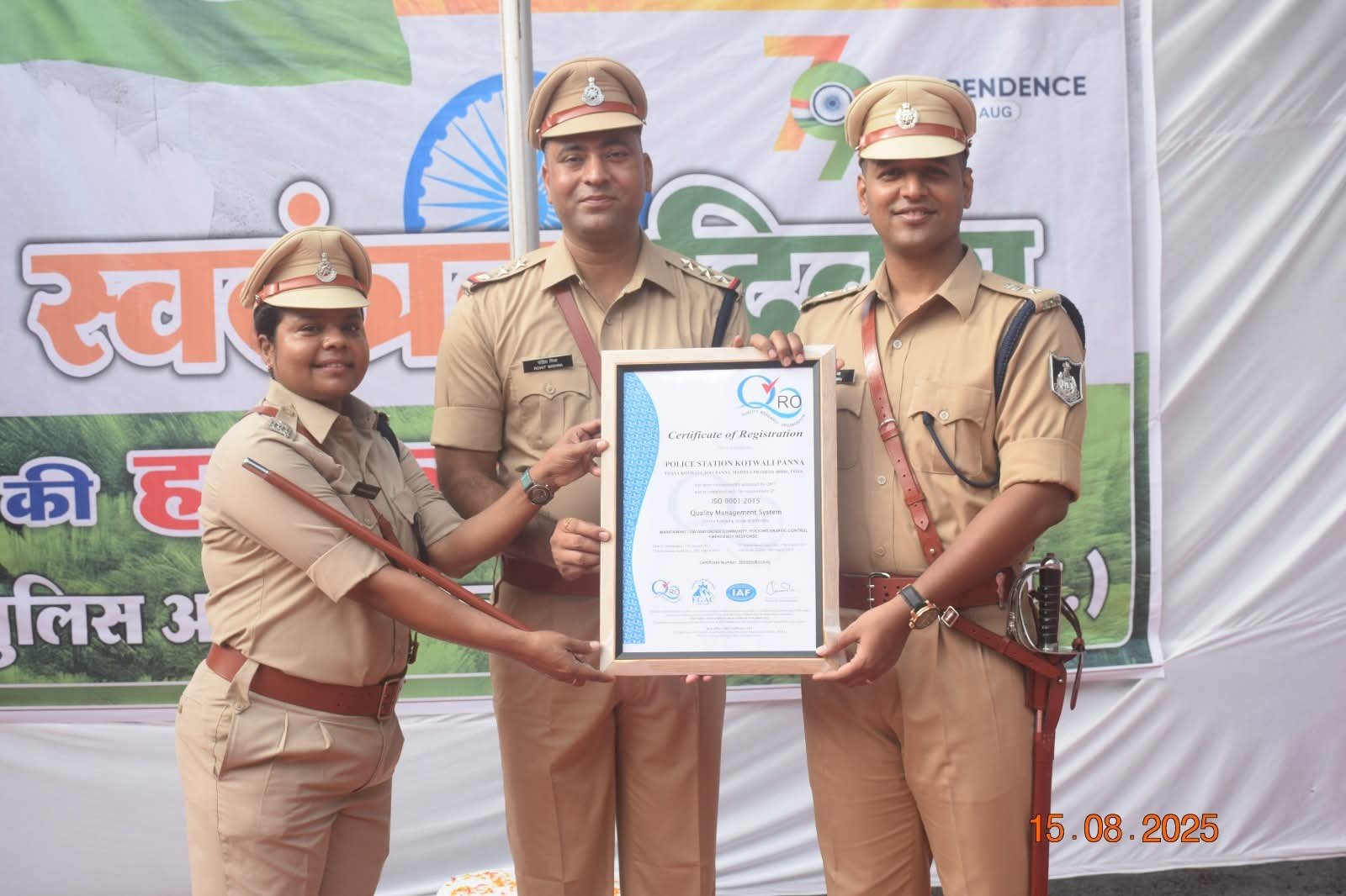 पुलिस अधीक्षक पन्ना श्री साईं कृष्ण एस. थोटा के कुशल मार्गदर्शन में, पन्ना पुलिस का कोतवाली थाना अंतरराष्ट्रीय स्तर की गुणवत्ता मानकों से प्रमाणित होकर ISO 9001:2015 क्वालिटी मैनेजमेंट सिस्टम प्रमाण पत्र प्राप्त करने वाला जिला का प्रमुख थाना बन गया है। यह सम्मान Quality Research Organization (QRO) द्वारा EGAC तथा IAF जैसी अंतरराष्ट्रीय मान्यता प्राप्त संस्थाओं के सहयोग से प्रदान किया गया है।