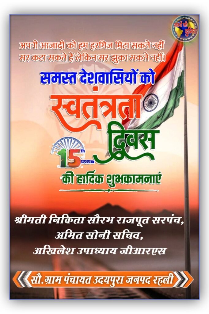 स्वतंत्रता दिवस की आधिकारिक थीम “विकसित भारत” है। यह थीम -2047 तक भारत को एक विकसित राष्ट्र में बदलने के लिए सरकार के दृष्टिकोण का प्रतीक है। यह थीम बुनियादी ढाँचे, प्रौद्योगिकी, शिक्षा, स्वास्थ्य एवं सेना जैसे प्रमुख क्षेत्रों में ध्यान केन्द्रित करता है। आईये इस आजादी का सम्मान करें और हर घर में तिरंगा फहराकर राष्ट्र प्रेम की भावना को और सशक्त करें। यह पर्व हमारे आत्म गौरव एवं राष्ट्रीय चेतना का प्रतीक हैं, वह हमें इसे सुरक्षित एवं संरचित भी करना है। हमें अपने कर्तव्य को निभाते हुए एक सशक्त, समृद्ध और आत्मनिर्भर भारत को निर्माण करना होगा। “देश के लिए मर मिटने वालों को प्रणाम स्वतंत्रता को बनाये रखना ही है हमारा कर्तव्य। ।। जय हिन्द, जय भारत ।। वन्दे मातरम्