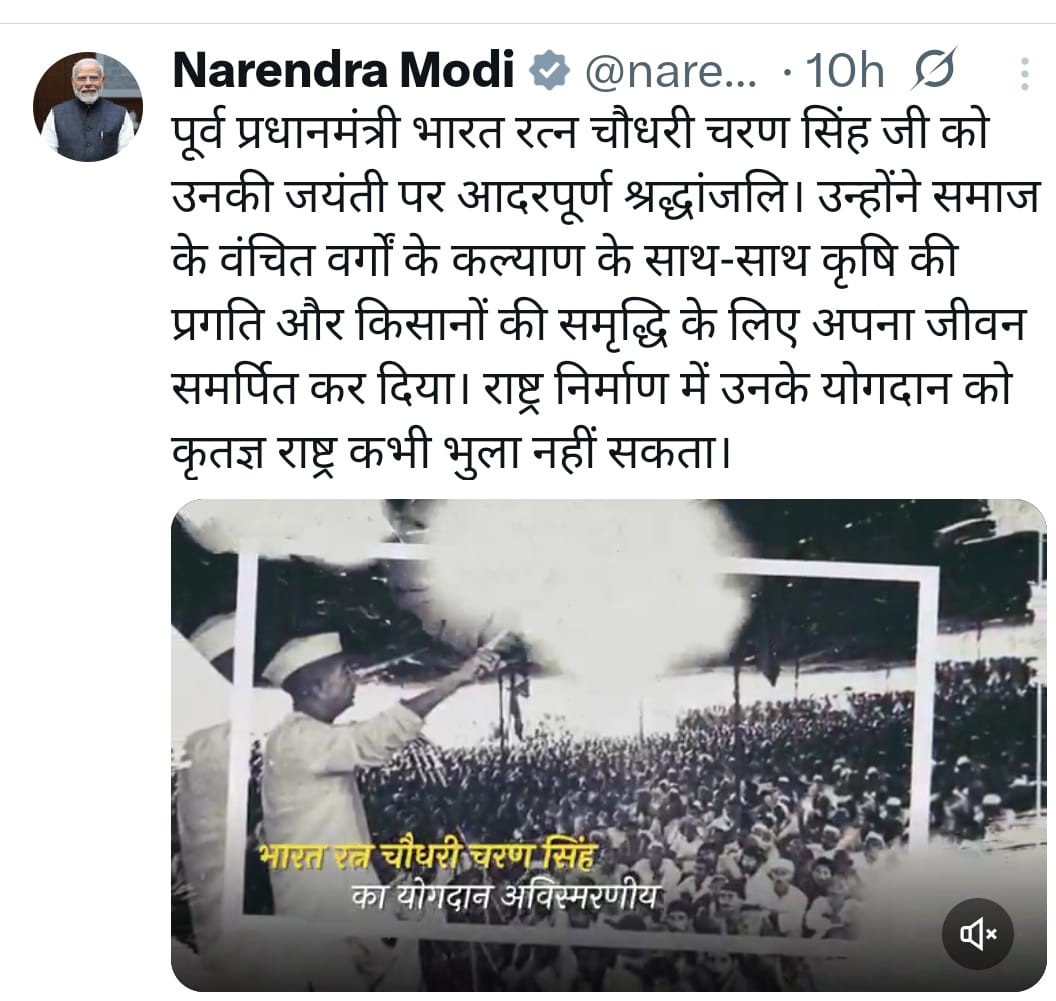 “पूर्व प्रधानमंत्री भारत रत्न चौधरी चरण सिंह जी को उनकी जयंती पर आदरपूर्ण श्रद्धांजलि। उन्होंने समाज के वंचित वर्गों के कल्याण के साथ-साथ कृषि की प्रगति और किसानों की समृद्धि के लिए अपना जीवन समर्पित कर दिया। राष्ट्र निर्माण में उनके योगदान को कृतज्ञ राष्ट्र कभी भुला नहीं सकता।”