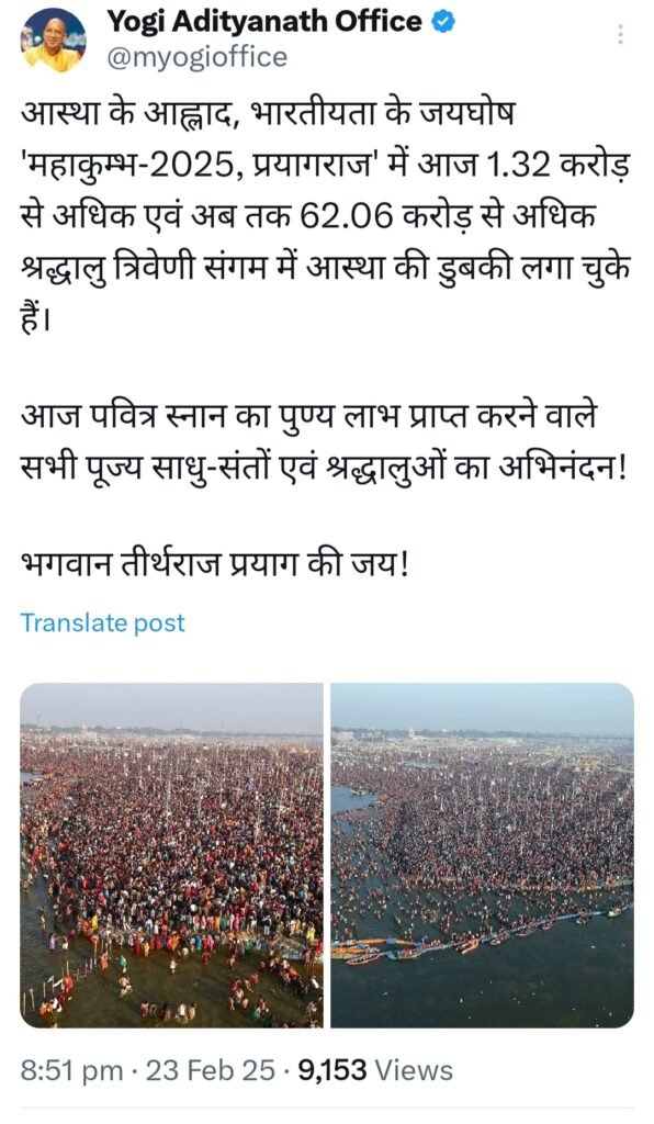 आस्था के संगम, भारतीयता के जयघोष ‘महाकुम्भ-2025, प्रयागराज’ में रविवार 23 फरवरी को 1.32 करोड़ से अधिक एवं अब तक 62.06 करोड़ से अधिक श्रद्धालु त्रिवेणी संगम में आस्था की डुबकी लगा चुके हैं उक्त जानकारी उत्तर प्रदेश के मुख्यमंत्री योगी आदित्यनाथ ने सोशल मीडिया x पर शेयर की है।