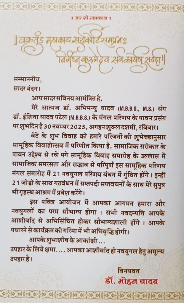 यह विदित हो कि मुख्यमंत्री डॉ. यादव से पूर्व, राज्य के वरिष्ठ नेता और पूर्व मंत्री गोपाल भार्गव ने भी कुछ वर्ष पहले अपने बेटे और बेटी का विवाह सामूहिक समारोह में करवाकर समाज में एक सकारात्मक संदेश दिया था।