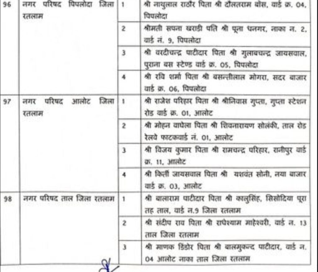 नगर परिषद सतवास: अमित जोशी, प्यारेलाल प्रजापत, दीपक राठौर, राजेंद्र यादव