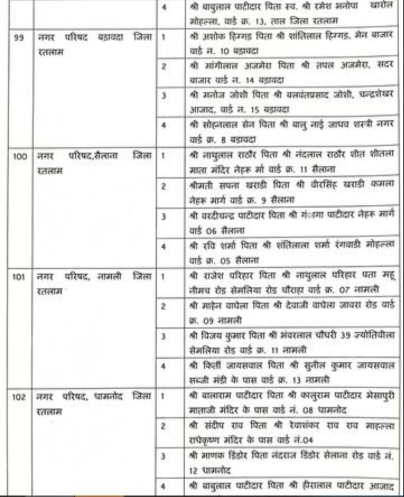 नगर परिषद बदनावर: मितेश शर्मा, भूपेंद्र सिंह राठौड़, कपिल नहर, कन्हैयालाल गुर्जर