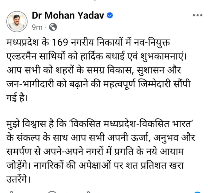 मध्यप्रदेश के 169 नगरीय निकायों में नव-नियुक्त एल्डरमैन की सूची जारी ।सीएम यादव ने कहा सभी साथियों को हार्दिक बधाई एवं शुभकामनाएं। सीओआप सभी को शहरों के समग्र विकास, सुशासन और जन-भागीदारी को बढ़ाने की महत्वपूर्ण जिम्मेदारी सौंपी गई है।