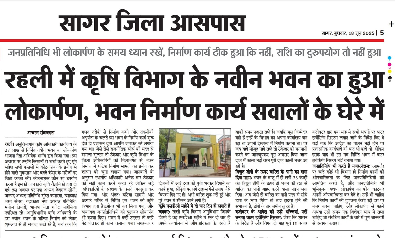 अनुविभागीय कृषि अधिकारी के इस नवीन भवन के घटिया निर्माण को लेकर शुरुआत से ही सवाल उठते रहे है,यहां तक कि गलत तरीके से निर्माण करने और तकनीकी अपूर्णता के चलते इस भवन के निर्माण कार्य शुरू होते ही प्रशासन द्वारा आपत्ति जताकर स्टे लगाया गया था।जैसे तैसे राजनीतिक सोर्स की मदद से मामला सुलझा तो ठेकेदार और कृषि विभाग के जिला अधिकारियों की मिलीभगत से भवन निर्माण में घटिया निर्माण सामग्री का प्रयोग कर शासन को चूना लगाया गया। जानकारी के अनुसार स्थानीय अधिकारी अनेक बार ठेकेदार को सही काम करने कहते रहे लेकिन बड़े अधिकारियों के संरक्षण के चलते अनसुना कर दिया गया। और अंततः घटिया सामग्री और अटपटे तरीके से निर्मित इस भवन को कृषि विभाग द्वारा हैंडओवर भी कर लिया गया,और बाकायदा जनप्रतिनिधियों को बुलाकर लोकार्पण भी करवा दिया।