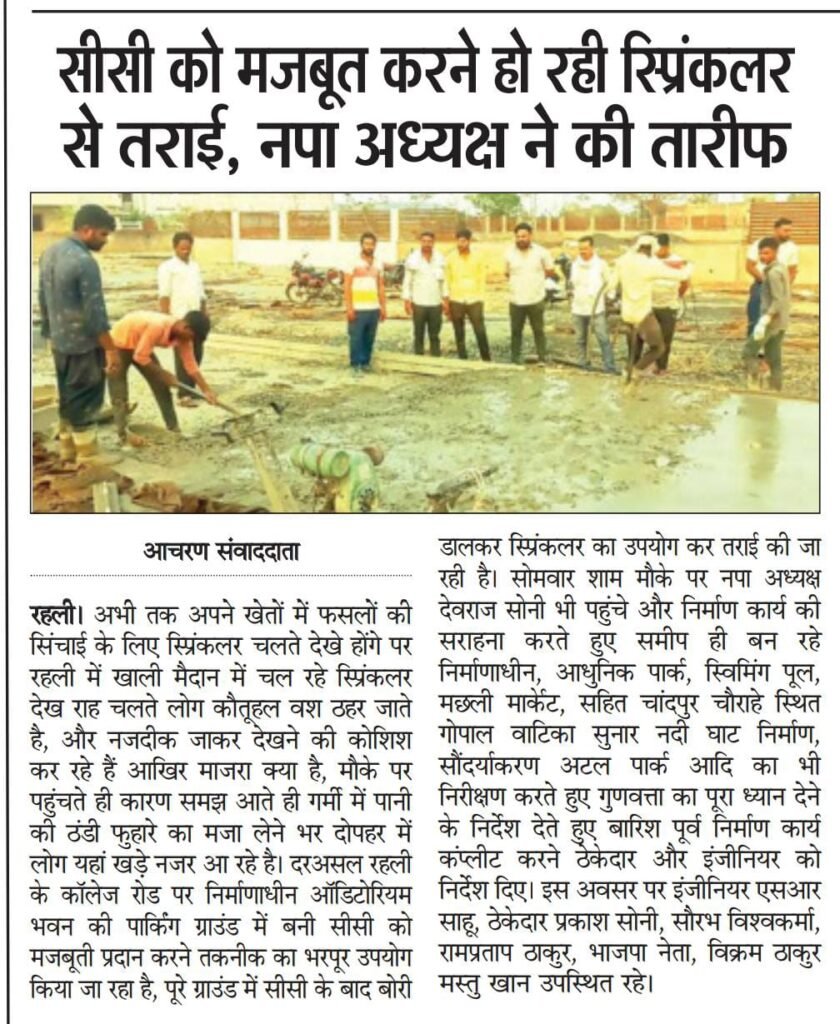 दरअसल रहली के कालेज रोड पर निर्माणाधीन ऑडिटोरियम भवन की पार्किंग ग्राउंड में बनी सीसी को मजबूती प्रदान करने तकनीक का भरपूर उपयोग किया जा रहा है,पूरे ग्राउंड में सीसी के बाद बोरी डालकर स्प्रिंगकीलर का उपयोग कर तराई की जा रही है।सोमवार शाम मौके पर नपा अध्यक्ष देवराज सोनी भी पहुंचे और निर्माण कार्य की सराहना करते हुए समीप ही बन रहे निर्माणाधीन,आधुनिक पार्क,स्विमिंग पूल,मछली मार्केट, सहित चांदपुर चौराहे स्थित गोपाल वाटिका सुनार नदी घाट निर्माण,सौंदर्याकरण अटल पार्क आदि का भी निरीक्षण करते हुए गुणवत्ता का पूरा ध्यान देने के निर्देश देते हुए बारिश पूर्व निर्माण कार्य कंप्लीट करने ठेकेदार और इंजीनियर को निर्देश दिए।
