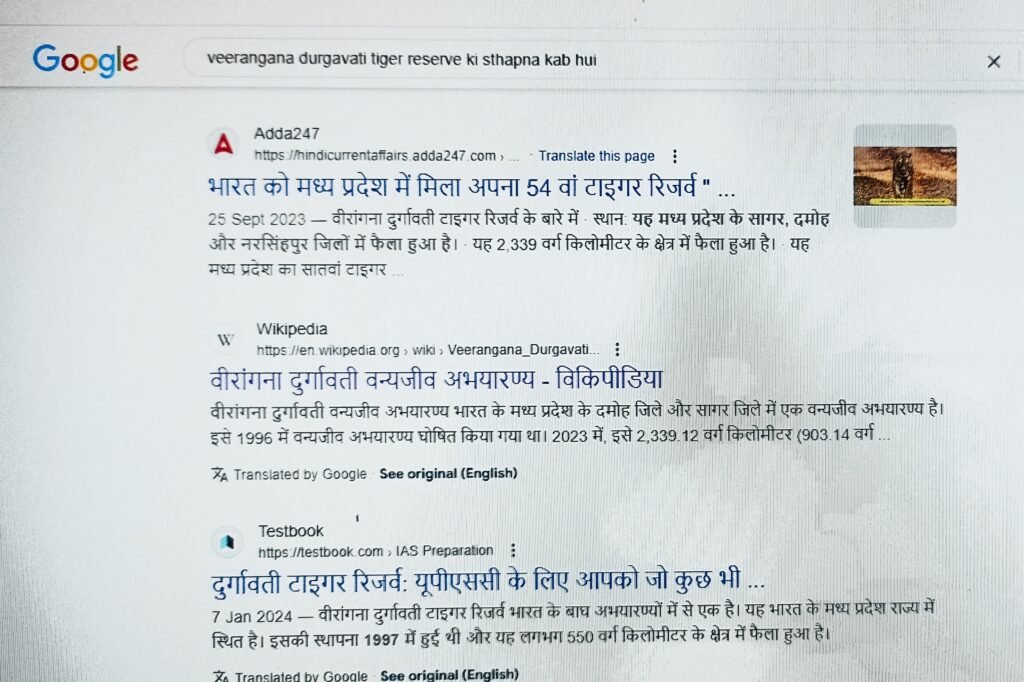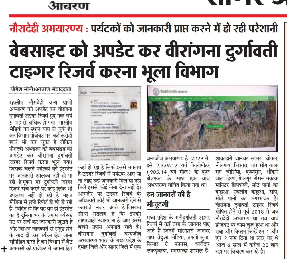 मप्र ।नौरादेही वन्य प्राणी अभ्यारण को अपडेट कर वीरांगना दुर्गावती टाइगर रिजर्व हुए एक वर्ष 5 माह से अधिक हो गया,भारतीय भेड़ियों का स्थान बाघ ले चुके है। वन विभाग प्रोजेक्ट पर कई करोड़ों खर्च भी कर चुका हे लेकिन नौरादेही अभ्यारण की बेबसाइड को अपडेट कर वीरांगना दुर्गावती टाइगर रिजर्व करना भूल गया। जिसके चलते पर्यटकों को इंटरनेट पर जानकारी उपलब्ध नहीं हो पा रही हे,गूगल पर दुर्गावती टाइगर रिजर्व सर्च करने पर कोई लिंक भी उपलब्ध नहीं हो रही हे महज मीडिया में छपी रिपोर्ट ही शो हो रही है। विदित हो कि यह युग ही इंटरनेट का है दुनिया भर के तमाम पर्यटक नेट पर सर्च कर जानकारी जुटाते है और विभिन्न जानकारी से संतुष्ट होने के बाद ही उस पर्यटन क्षेत्र जाना सुनिश्चित करते है
