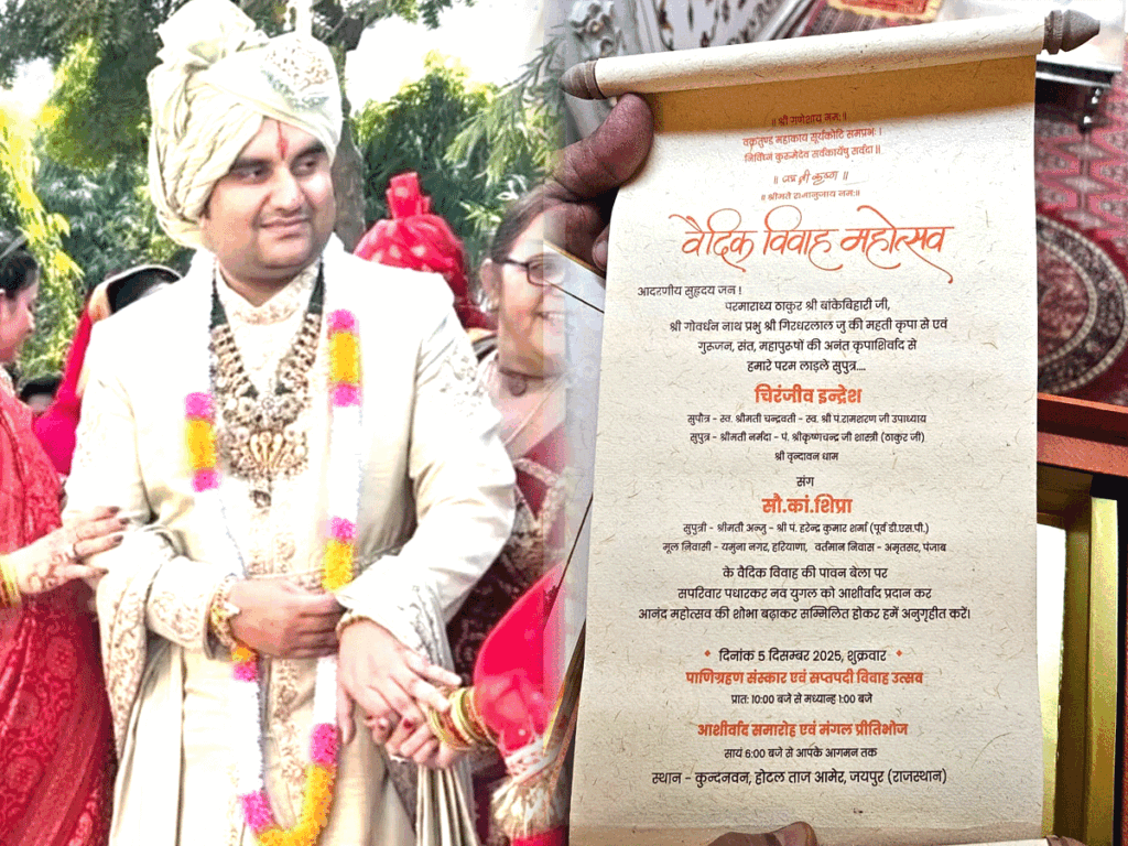 इंद्रेश और शिप्रा के विवाह के लिए एक विशेष आमंत्रण पत्र तैयार कराया गया । इसके साथ वृंदावनधाम के विभिन्न प्रसिद्ध मंदिरों का प्रसाद भी भेजा गया है। इसमें राधारमणजी से मिश्री-इलायची, तुलसी सहित अन्य मंदिरों से लड्डू भेजे गए हैं।